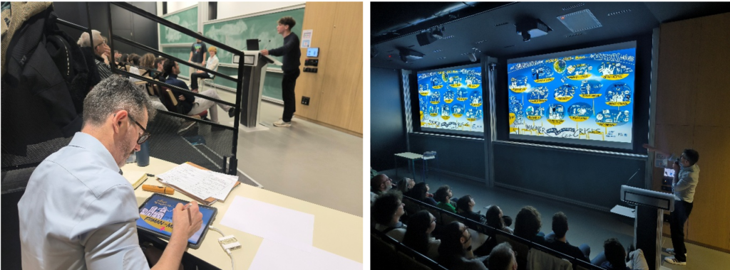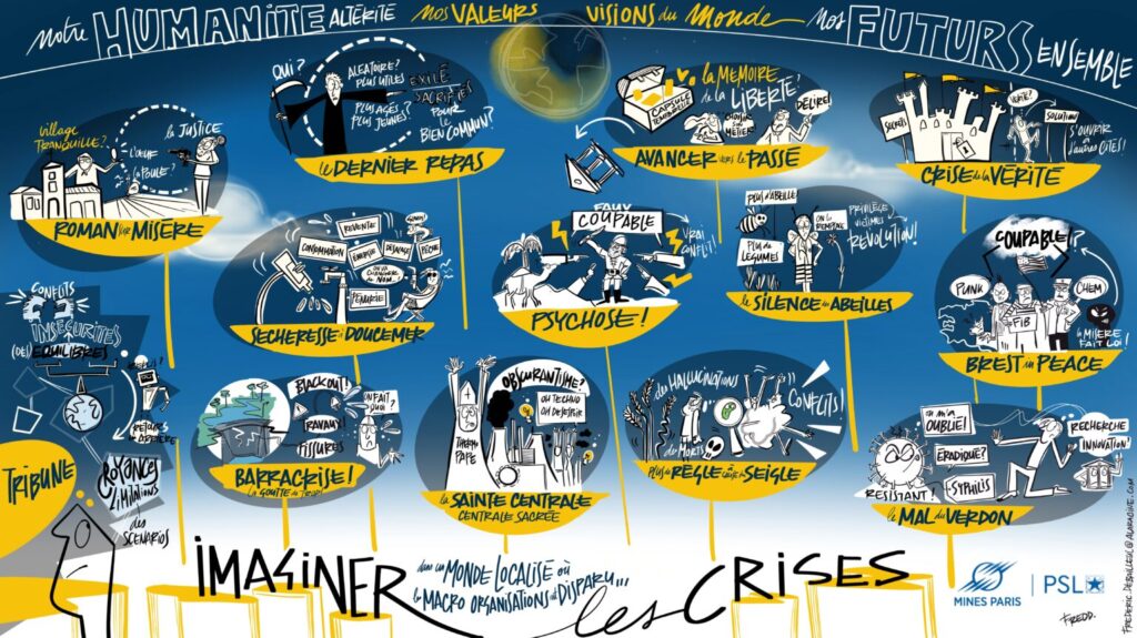 Ce dispositif est enrichi par le travail du facilitateur graphique, Frédéric Debailleul, dont la fresque accompagne et synthétise visuellement l’ensemble des travaux réalisés durant ce cours. En capturant les idées, les interactions et les enchaînements de phénomènes, elle offre une représentation globale des crises étudiées et des liens entre leurs différentes composantes.