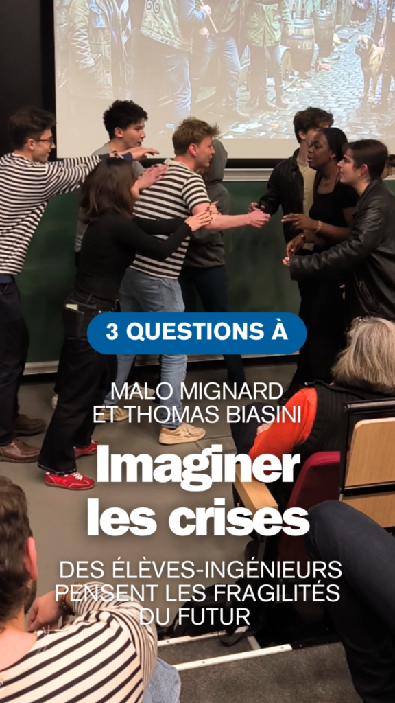 Le cours « Imaginer les crises » propose un apprentissage au croisement de plusieurs disciplines. Les élèves travaillent pendant cinq demi-journées sur des problématiques complexes, pour lesquelles il faut non seulement mobiliser des connaissances et des techniques d’ingénieurs, mais aussi comprendre les dynamiques sociales et humaines, articuler les travaux collectifs et construire des récits cohérents.