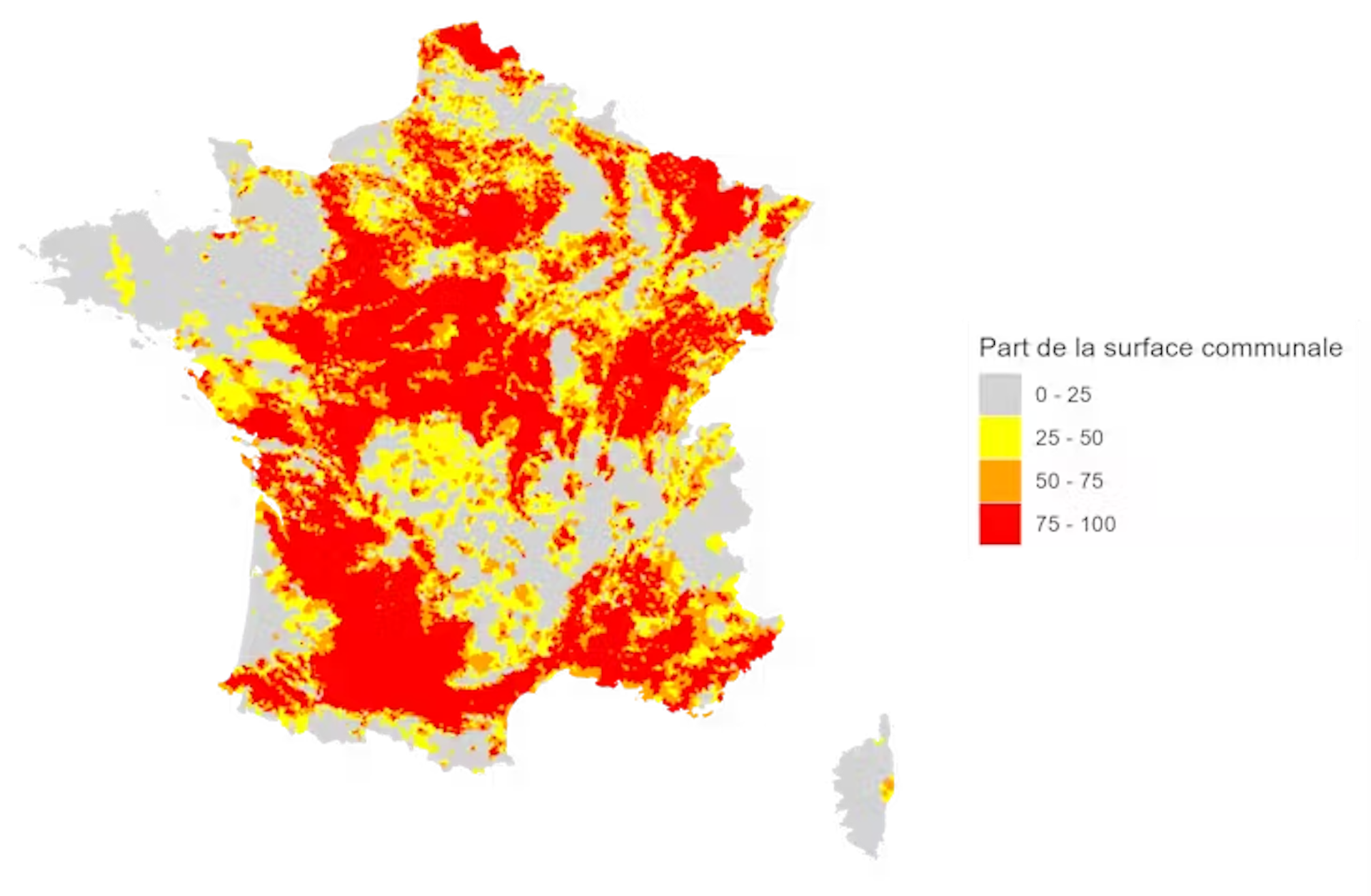 Percentage of communal surface exposed to medium or high RGA risk. BRGM