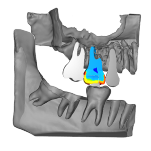 Distribution of elastic moduli (Young’s modulus) in a cross-sectional view (maxilla at the top and mandible at the bottom), showing the presence of a food bolus (a piece of food) between the two chewing teeth.