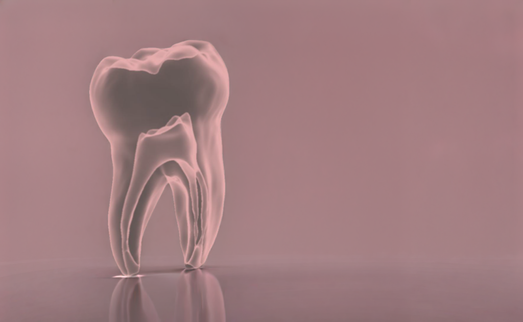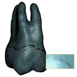 Highly detailed 3D model of a molar (approximately 1.3 million elements), created from medical imaging, enabling simulation of stress distribution within the tooth and its surrounding environment during mastication.