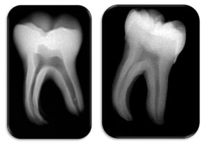 The comparison highlights an accurate reproduction of the internal anatomy, particularly the pulp chamber and root canals.