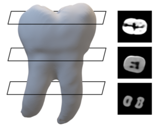 3D-printable tooth model. The property gradient is achieved through grayscale levels in the cross-sectional images. The intensity of the lamp used for polymerization (in the printer) is inversely proportional to the grayscale level: the whiter the area, the more the composite resin is polymerized during printing. Conversely, the darker the area, the less it is polymerized.