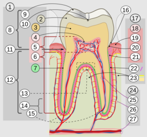 1.Tooth; 2. Enamel; 3. Dentin; 4. Dental pulp; 5. Coronal pulp; 6. Radicular pulp; 7. Cementum; 8. Crown; 9. Cusp; 10. Groove; 11. Neck; 12. Root; 13. Furcation; 14. Root apex; 15. Apical foramen; 16. Sulcus; 17. Periodontium. 18. Gingiva: 19. Free gingiva; 20. Marginal gingiva; 21. Attached gingiva. 22. Periodontal ligament; 23. Alveolar bone. 24.Nerves and vessels: 25. Dental; 26. Periodontal; 27. Alveolar nerve.