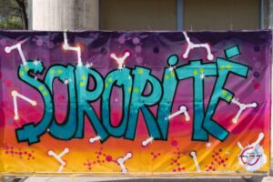 Les participantes ont réalisé collectivement une fresque aux côtés de l’association Place for Art. Elles ont choisi un mot pour symboliser leur expérience : « sororité ».